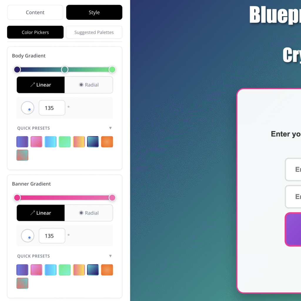 This is something I'm really proud of. Gradient backgrounds and buttons have always been tricky to make editable. So I developed a custom gradient color picker that lets you completely change gradient designs on the fly.