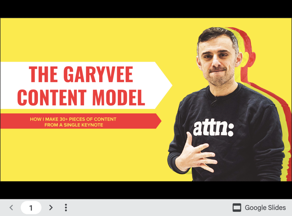 This isn't a video - it's a detailed slide deck that walks you through Gary's "Reverse Pyramid" content model. This is the systematic approach to creating once and distributing everywhere.